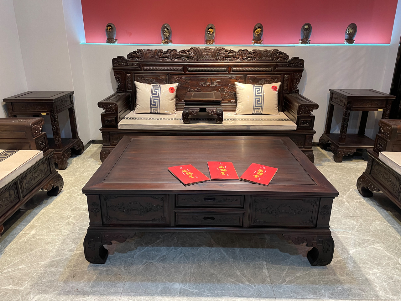 2、紅木家具在房間內具有較強的聚氣作用,能夠聚氣、聚財、聚人,從而改善人際關系,對人的事業發展和身心健康具有明顯的改善作用。